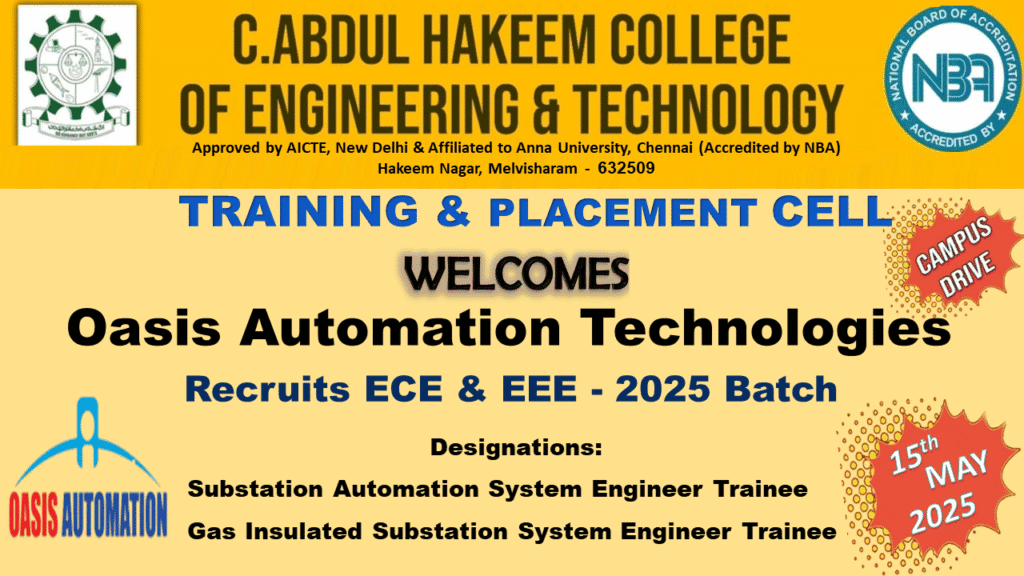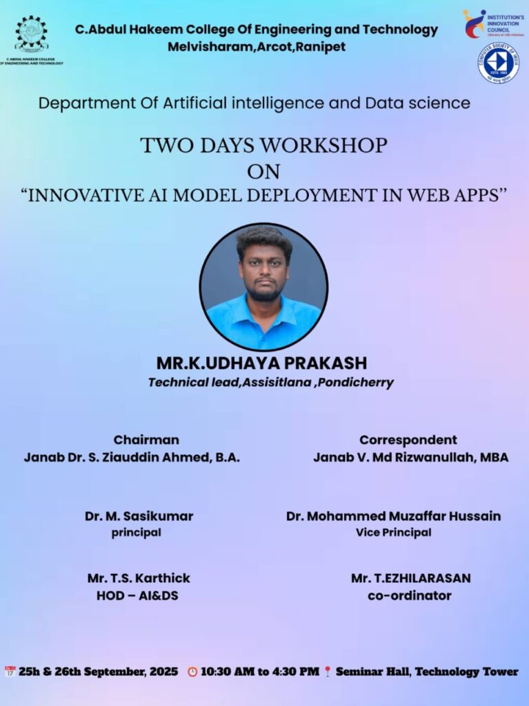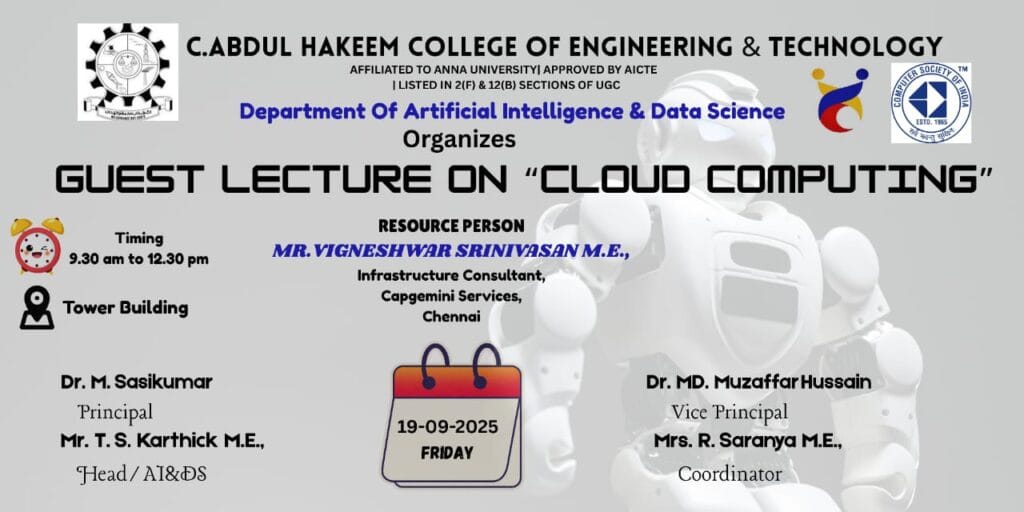 The Department of Information Technology, C. Abdul Hakeem College of Engineering and Technology, organized an “Innovation and Design Thinking Workshop on Full Stack Web Development” on October 15, 2025, at 2:00 PM in the Seminar Hall, Tower Block. The workshop was honored by the presence of our Principal, Dr. M. Sasikumar,Vice-Principal, Dr. A. Mohammed Muzaffar […]