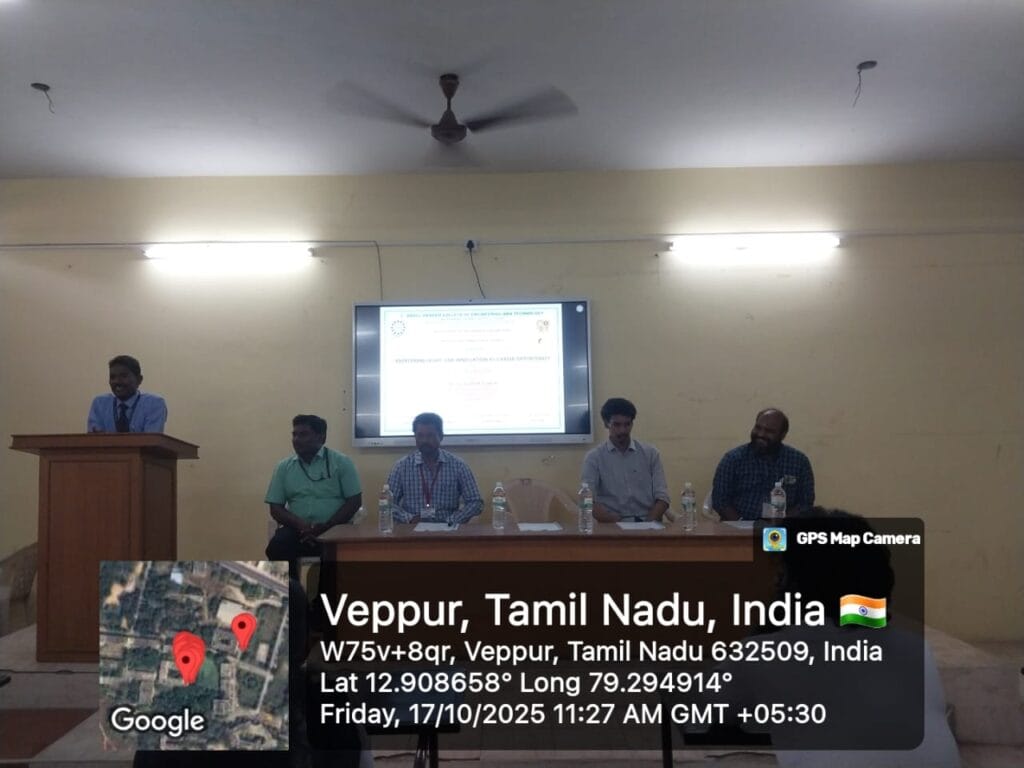 The Department of Mechanical Engineering and the Institution’s Innovation Council organized a workshop on “Entrepreneurship and Innovation as Career Opportunities.” The Chief Guest was Mr. G. Agiesh Ashok, CEO, Inzaneone Technology, Arcot, Ranipet District, on 17th October 2025.