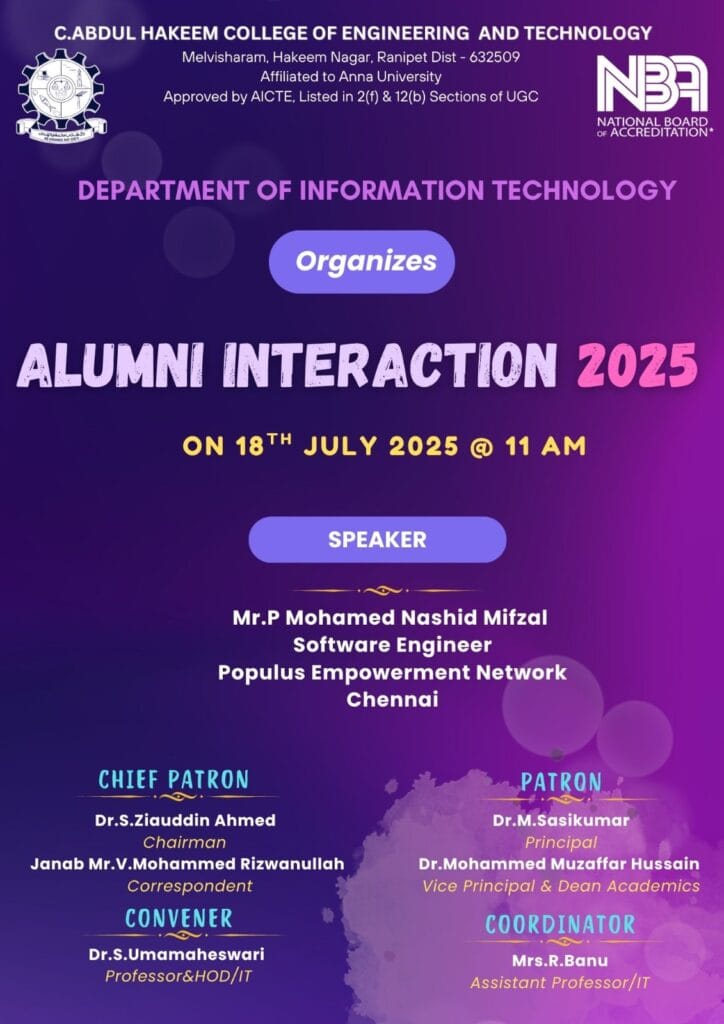 The Alumni Meet 2025 was a resounding success, with over 80 members participating in the online event. Our esteemed speaker, Mohamed Nashid Mifzal P, shared valuable insights and experiences as a Software Engineer at Populus Empowerment Network, Chennai. The event provided a platform for alumni to reconnect, network, and engage in meaningful discussions. Mohamed’s presentation […]