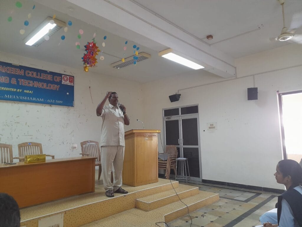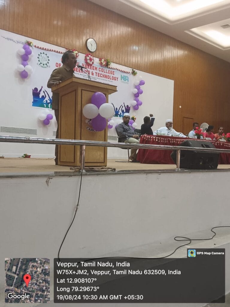 An ‘Orientation Programme’ was organized on Day 1 of induction program to welcome the first- year students who were admitted to Engineering program at the institute premises (on 19/08/2024), where students and parents were welcomed by the Management and Principal of C. Abdul Hakeem College of Engineering and Technology. The objective of the Programme was to make the parents and students aware of the academic aspects of the course, the rules and regulations of the Institute and ensuring parental participation in monitoring the performance and progress of the students. I year HOD, appraised students about the information required for the students.