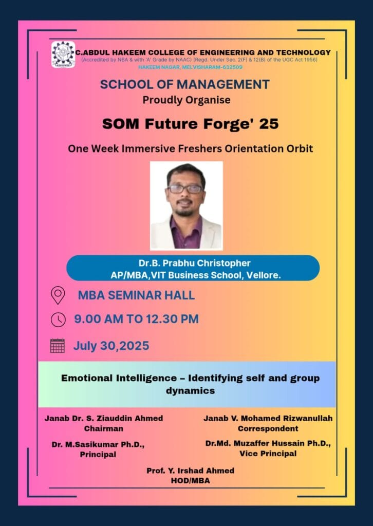 Dr. B. Prabu Christopher, an expert in emotional intelligence and leadership, will lead an engaging session that will help students recognize the importance of emotional awareness, empathy, and collaboration in both individual and team environments.