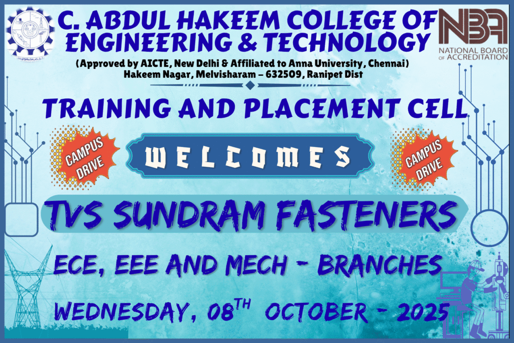 The Training and Placement Cell of C. Abdul Hakeem College of Engineering & Technology, Melvisharam, is pleased to announce a Campus Recruitment Drive by “TVS Sundram Fasteners Limited.”