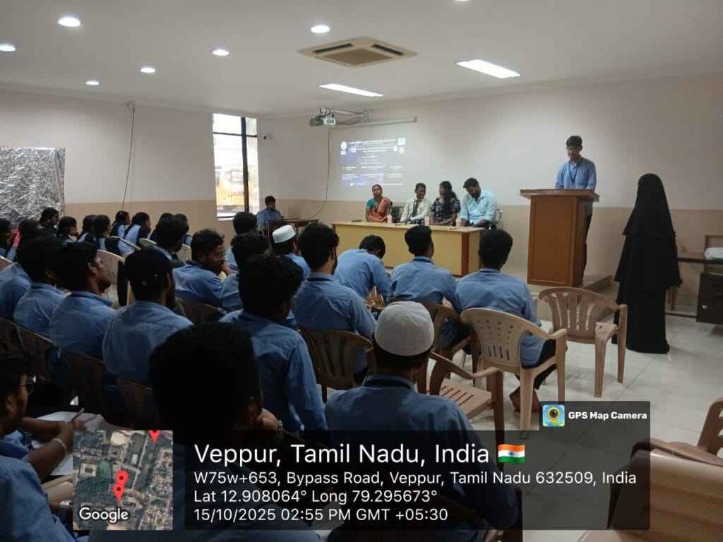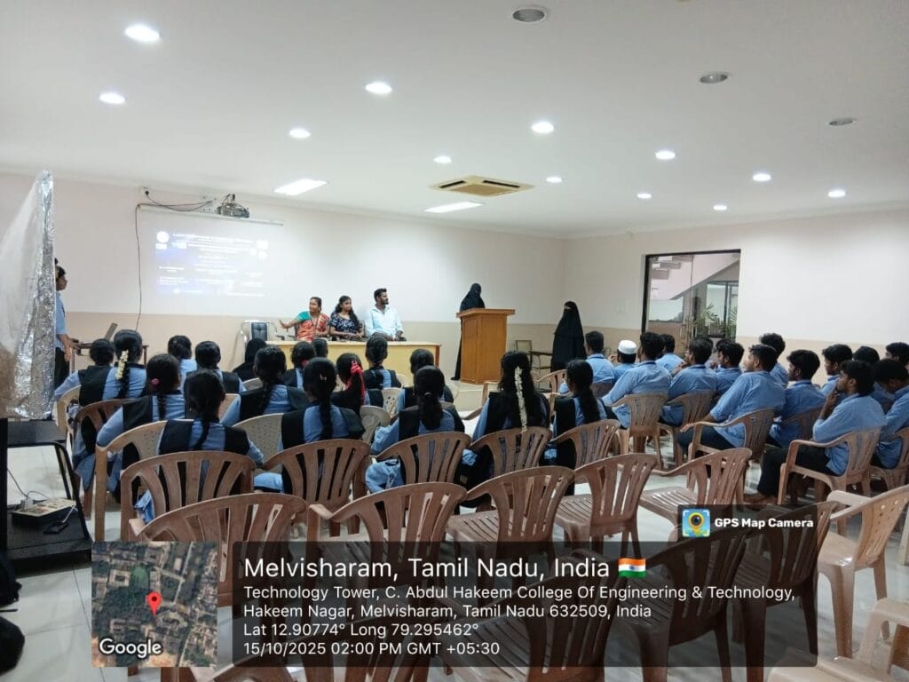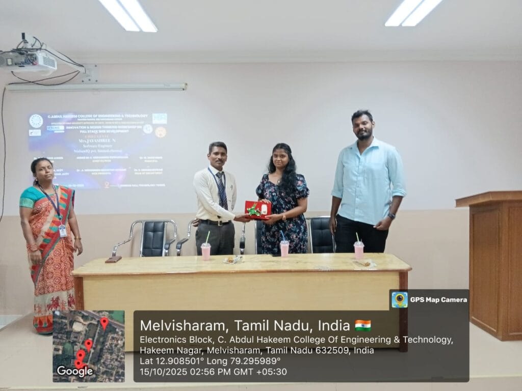 The Department of Information Technology, C. Abdul Hakeem College of Engineering and Technology, organized an “Innovation and Design Thinking Workshop on Full Stack Web Development” on October 15, 2025, at 2:00 PM in the Seminar Hall, Tower Block. The workshop was honored by the presence of our Principal, Dr. M. Sasikumar,Vice-Principal, Dr. A. Mohammed Muzaffar Hussain, and Head of the Department, Dr. S. Umamaheshwari. The event was coordinated by Mr. D. Kalaiyarasan, AP/IT, and Mrs. Sandhiya, AP/IT, and was attended by the second-year students of the IT department.