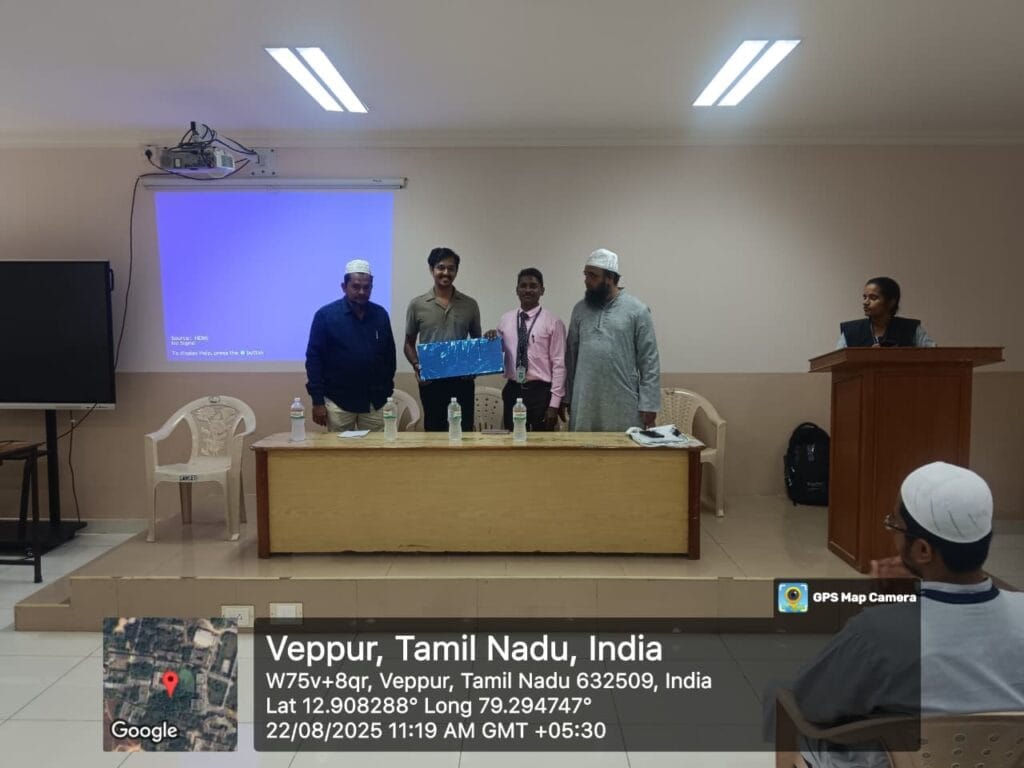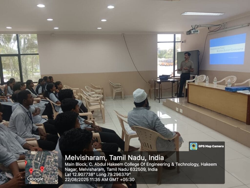 Mr Naresh Babu S Business Support coordinator M/s Natwest Bank UK addressing the gathering IV year students at a One day Session program on “Session on Innovation prototype validation converting innovation into a Start-up OR Session on Achieving” Value proposition fit” or ‘Business fit” ” on 22.08.2025 at our campus. Organized by the CSE Department.