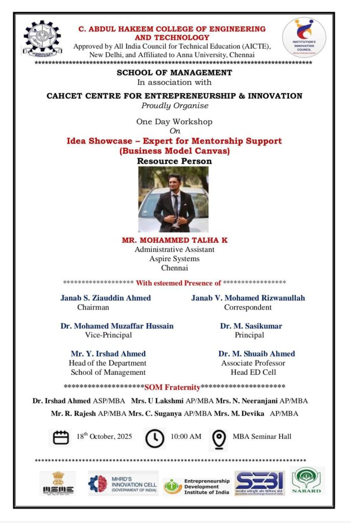 The School of Management, in collaboration with the CAHCET Centre for Entrepreneurship & Innovation, proudly organized a one-day workshop titled “Idea Showcase – Expert Mentorship Support.” This workshop aimed to provide a platform for budding entrepreneurs and innovators from the college to present their ideas and receive valuable guidance from industry experts.