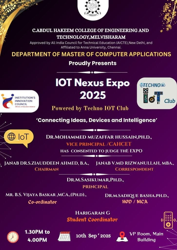 The Department of Master of Computer Applications is organizing a One-Day Innovative and Creative “IoT Nexus Expo–2025” on 10.09.2025 (Wednesday) from 1:30 p.m. to 4:30 p.m. at the Vice Principal’s Room, Main Block, powered by the MCA Techno IoT Club Activity, judged by Dr.Md.Muzaffar Hussain-VP/CAHCET.