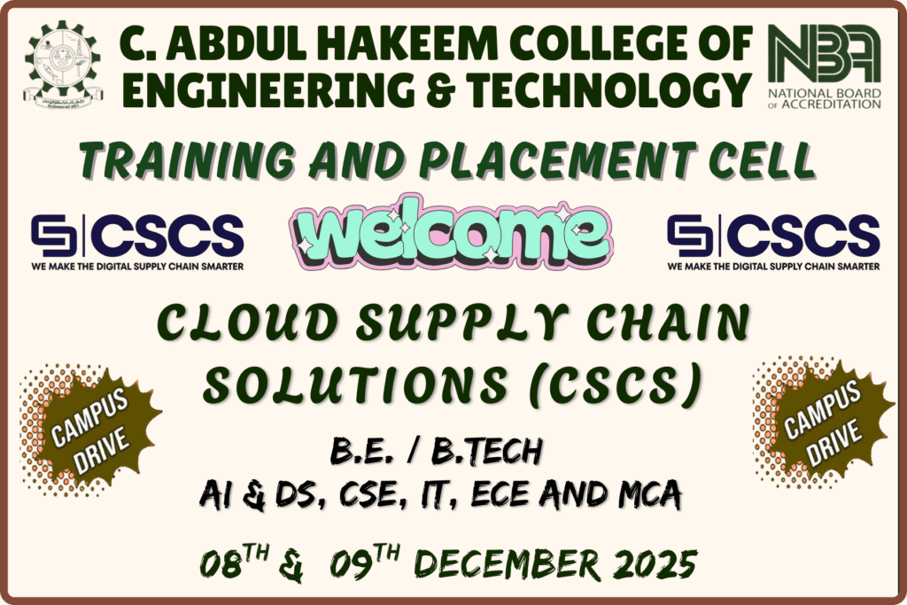 Best wishes from the management, principal, vice-principal, placement cell, faculty, and staff of C. Abdul Hakeem College of Engineering and Technology.