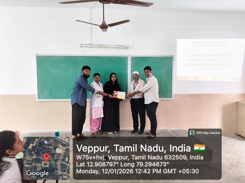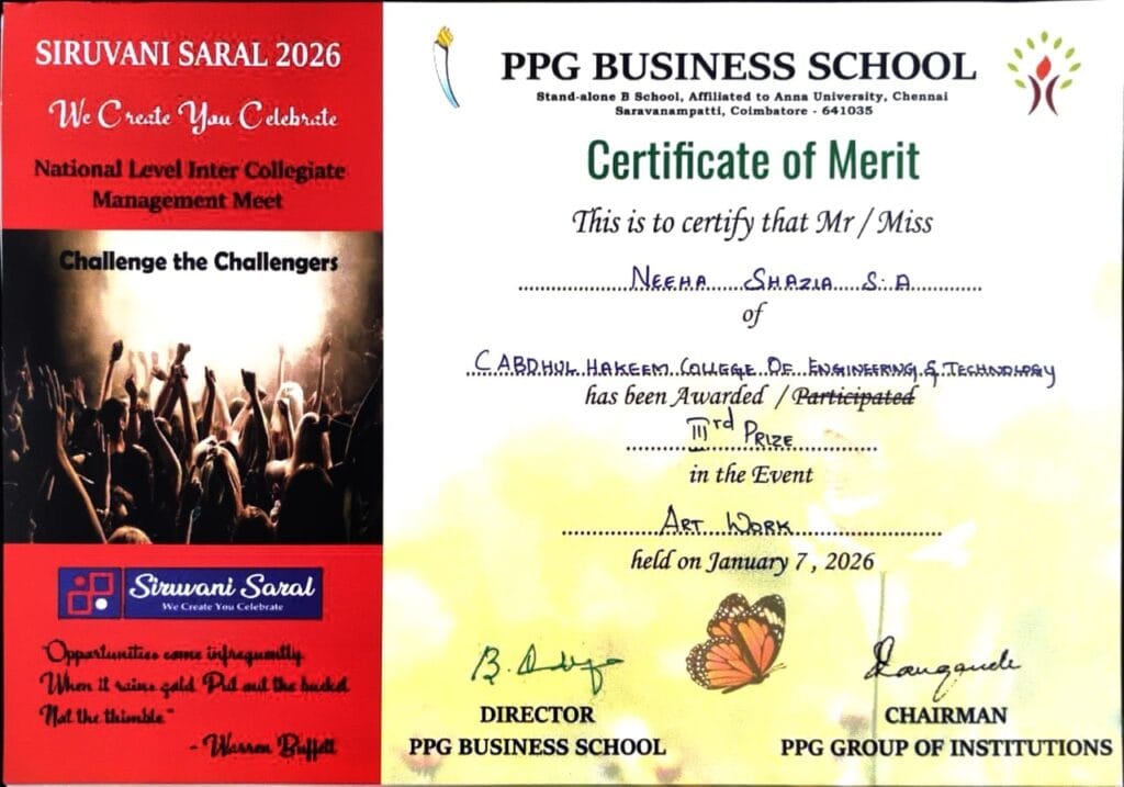 C. Abdul Hakeem College MBA students, including Neeha Shazia S.A. from the 1st year, won in the Art Work category at PPG Business School’s national-level inter-collegiate management meet held on January 7, 2026.