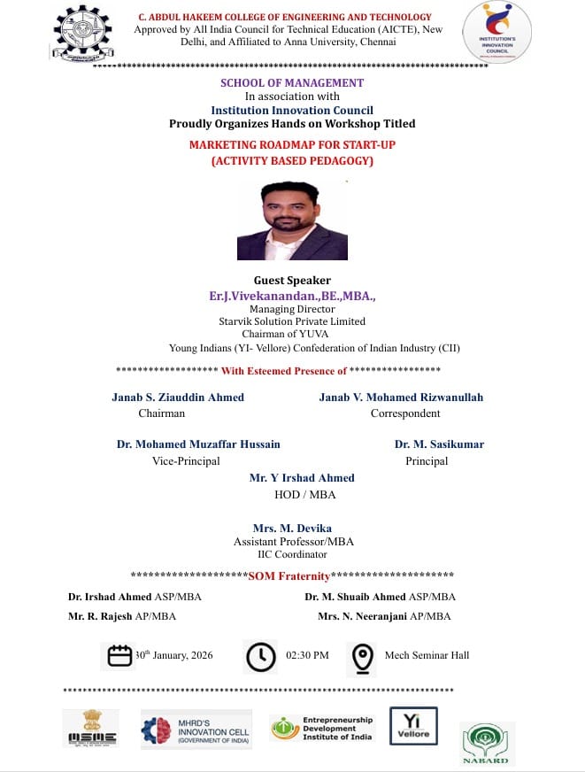 The School of Management at C. Abdul Hakeem College of Engineering and Technology, in association with the Institution Innovation Council (IIC), is proud to host a hands-on workshop focused on practical strategies for emerging businesses.