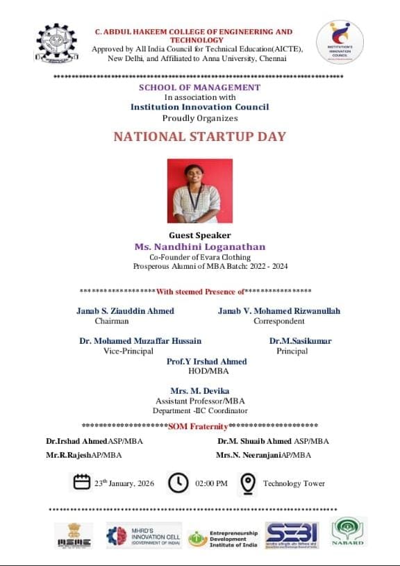 The School of Management (SOM), in association with the Institution Innovation Council (IIC), is proudly organizing a celebration for National Startup Day.