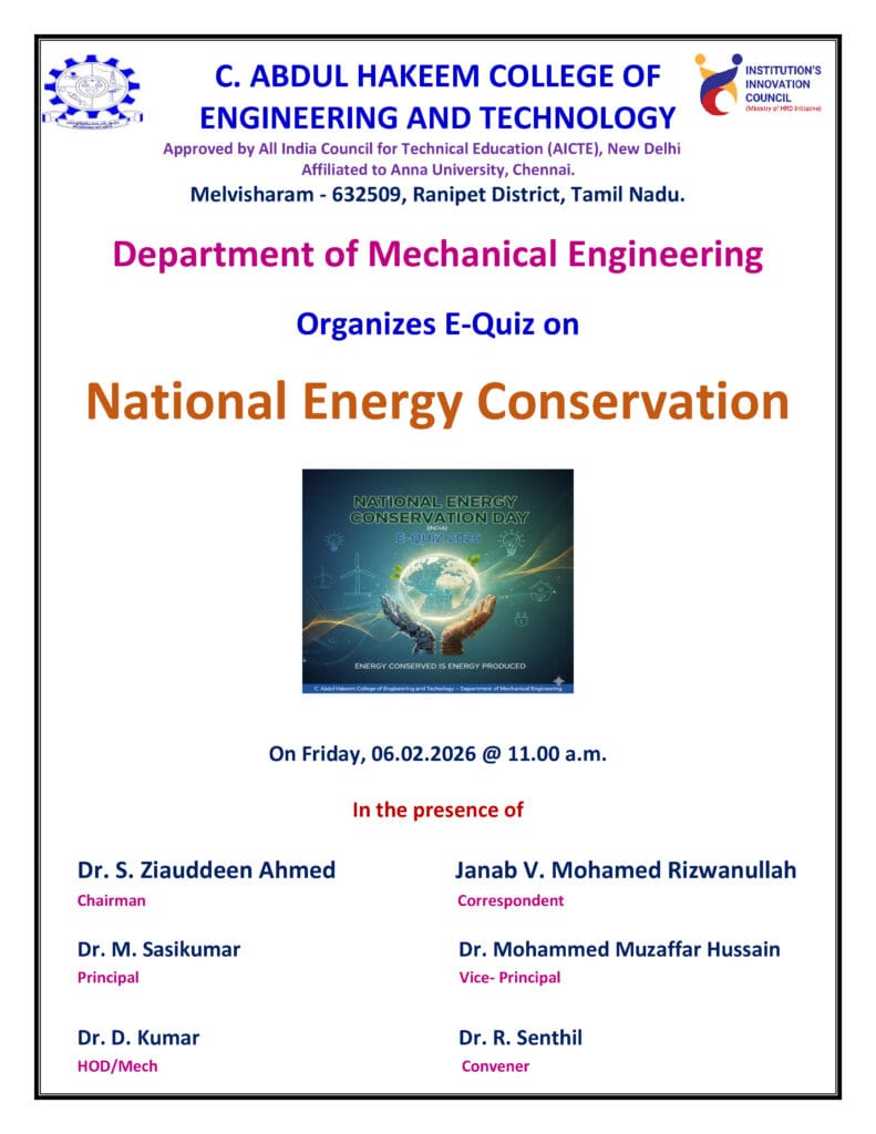 The Department of Mechanical Engineering, in association with the Institution’s Innovation Council (IIC), conducted an E-Quiz on 06.02.2026 to commemorate National Energy Conservation Day.