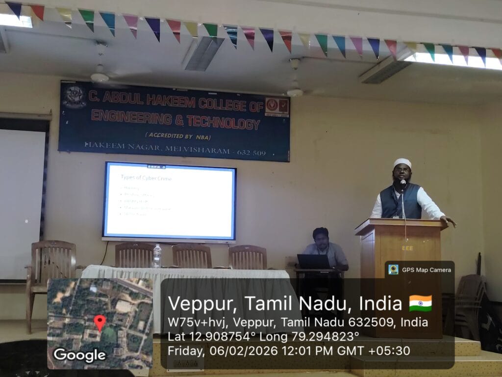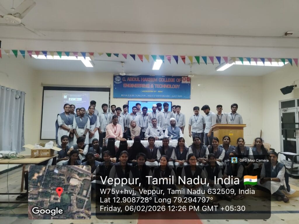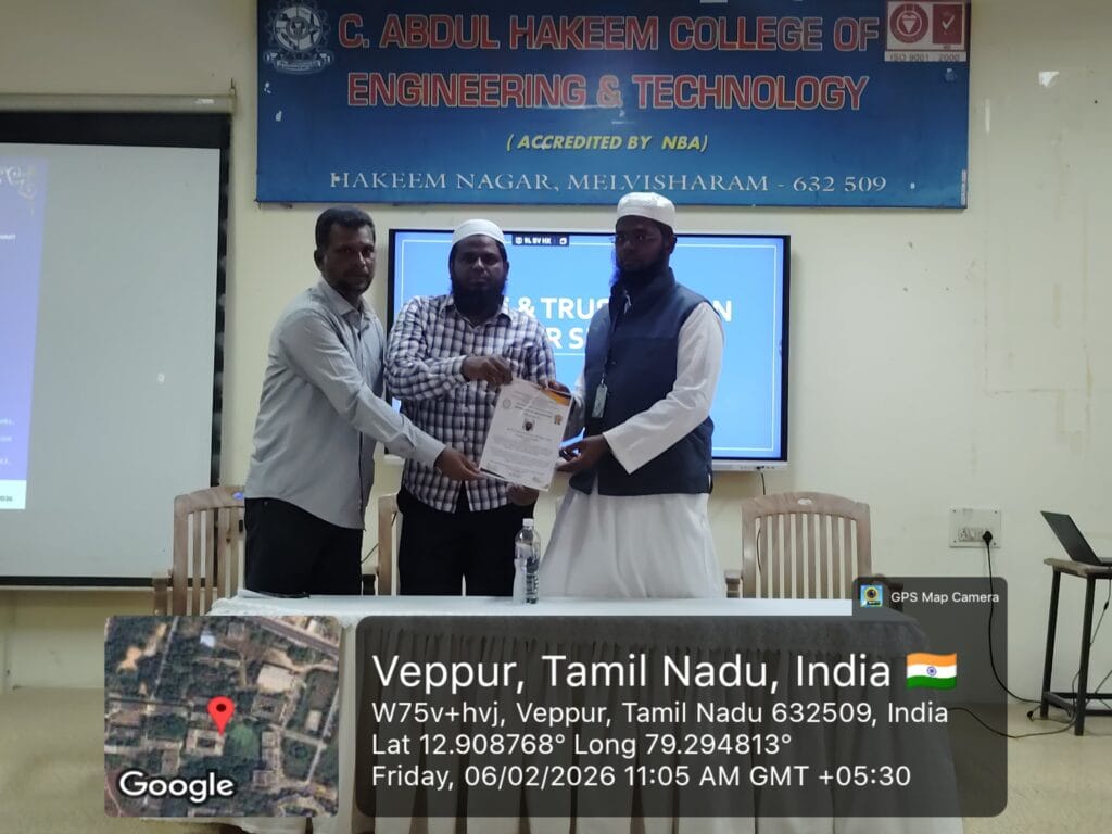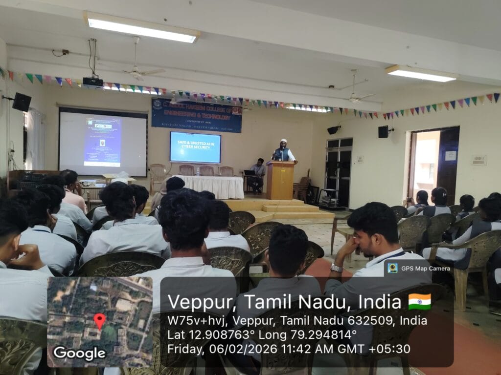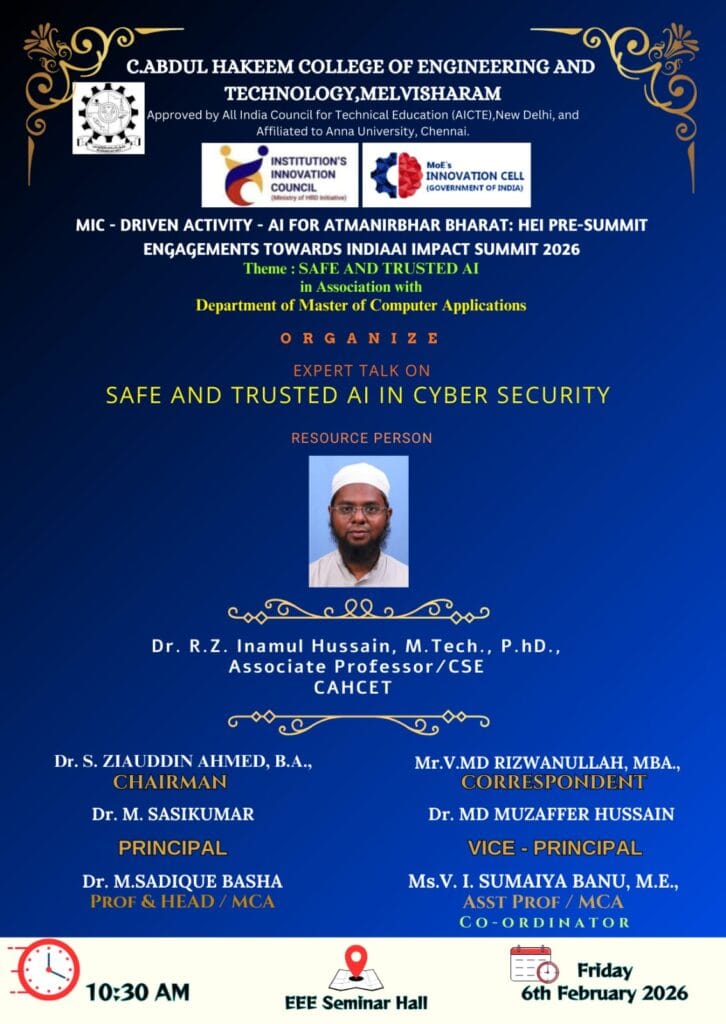 An IIC–MIC driven activity on “AI for Atmanirbhar Bharat” with the theme “Safe and Trusted AI” was organized by the Department of MCA on 6th February 2026. Dr. R. Z. Inamul Hussain, Associate Professor/CSE, CAHCET, was the Resource Person. The event was coordinated by V. I. Sumaiya Banu, AP/MCA, and was graced by the Vice Principal, CAHCET.