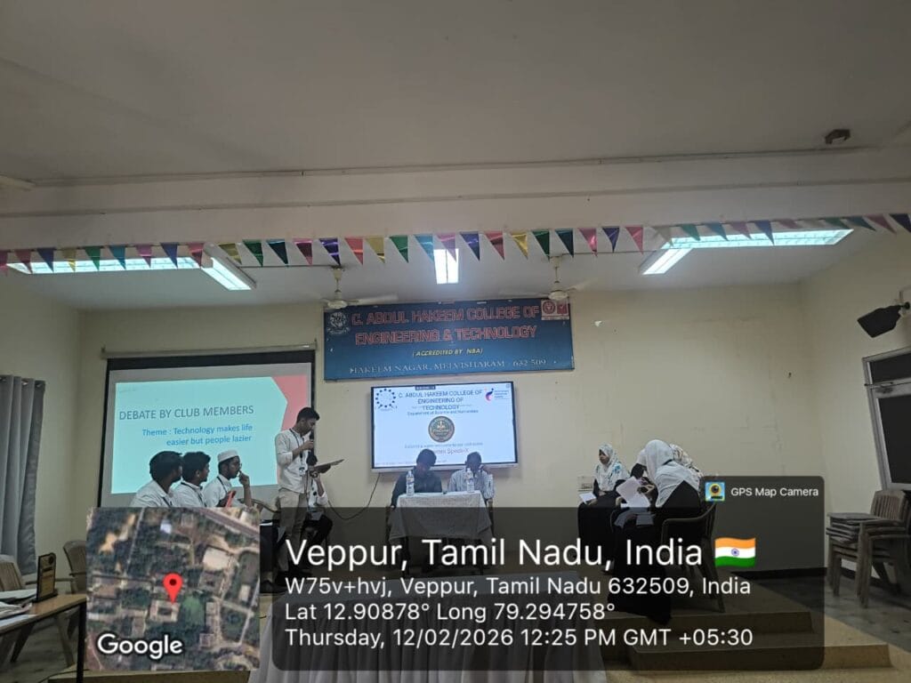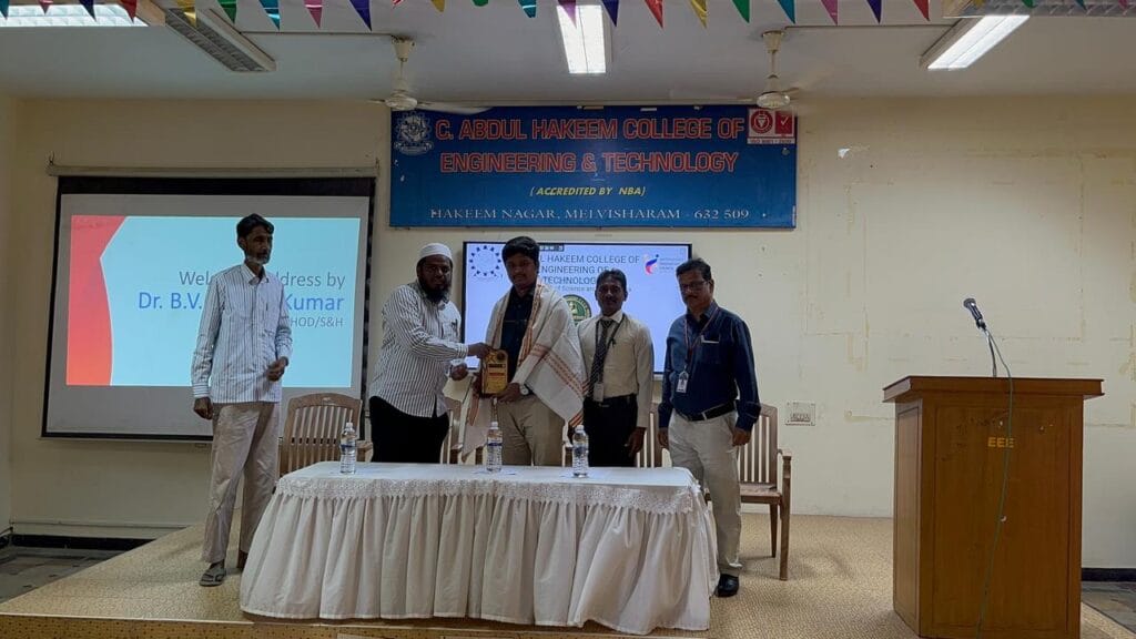 The Department of Science & Humanities, through the English Club of C. Abdul Hakeem College of Engineering and Technology, organized ProComm Speak-X on 12th February at 10:20 a.m. in the EEE Seminar Hall. The program began with a warm Welcome Address by Dr. B. V. Senthil Kumar, Head of the Department, who extended his greetings to the Chief Guest, management, faculty members, and students. In his address, he emphasized the importance of communication skills in academic growth and career success, and appreciated the English Club for organizing such an enriching program. This was followed by the Introduction of the Chief Guest by Mr. A. Vasantha Kumar, Assistant Professor of English, who highlighted the academic qualifications and professional achievements of Dr. K. R. Vivek, M.A., M.Phil., Ph.D., Assistant Professor of English, TJS Engineering College, Gummidipoondi, Chennai.