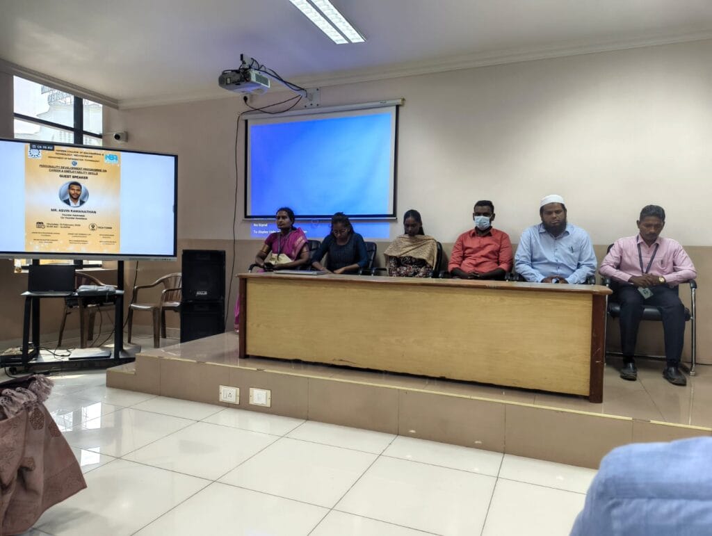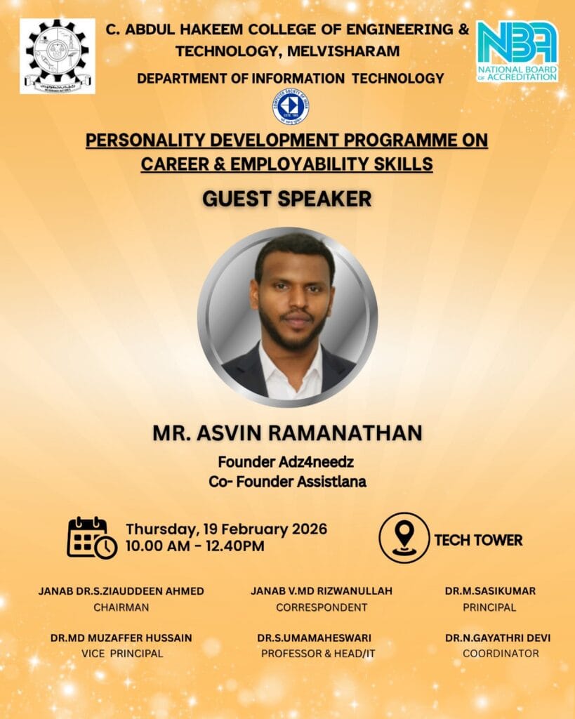 During the session, Mr. AsvinRamanathan emphasized the importance of communication skills, resume building, interview preparation, confidence building, and understanding industry expectations. He shared practical strategies to improve employability skills, develop a professional mindset, and adapt to corporate culture. He also motivated students to focus on continuous learning, networking, and skill enhancement beyond academics.