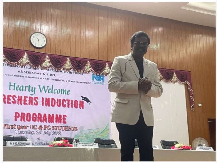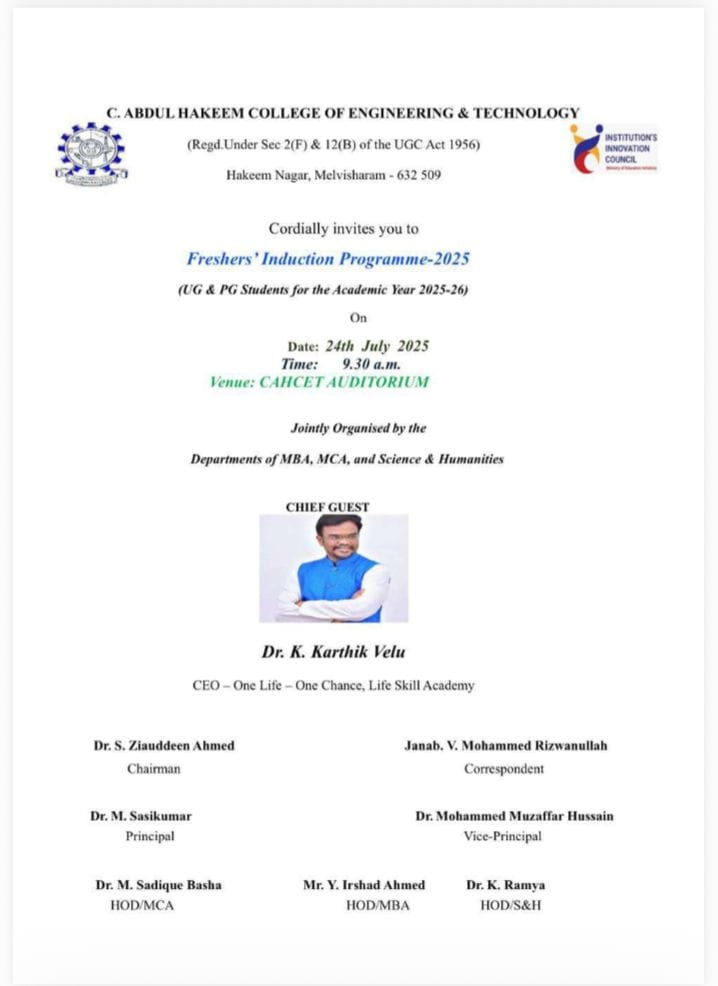 The Freshers’ Induction Programme for the academic year 2025–26 at C. Abdul Hakeem College of Engineering and Technology was inaugurated on 24th July 2025 at the CAHCET Auditorium, organized by the Departments of MBA, MCA, and Science & Humanities to welcome new UG and PG students. The event featured Dr. K. Karthik Velu, CEO of One Life – One Chance Life Skill Academy, as the chief guest, who delivered an inspiring keynote emphasizing life skills, self-belief, and a positive mindset for academic and professional success. The programme was attended by the institution’s leadership, including the Chairman, Correspondent, Principal, Vice-Principal, and Heads of Departments. It marked the beginning of a series of activities aimed at providing academic orientation…