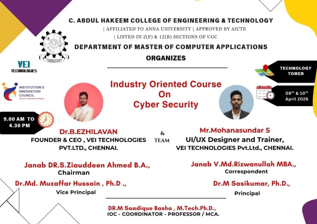 The Department of Master of Computer Applications (MCA) organized a Two-Days Industry Oriented Course on “Cyber Security” on 09th and 10th April 2026, with the objective of enhancing students’ Cyber Security skills and providing hands-on industry exposure.