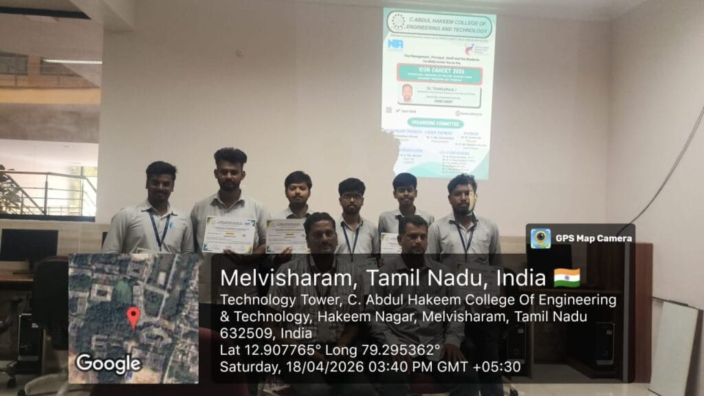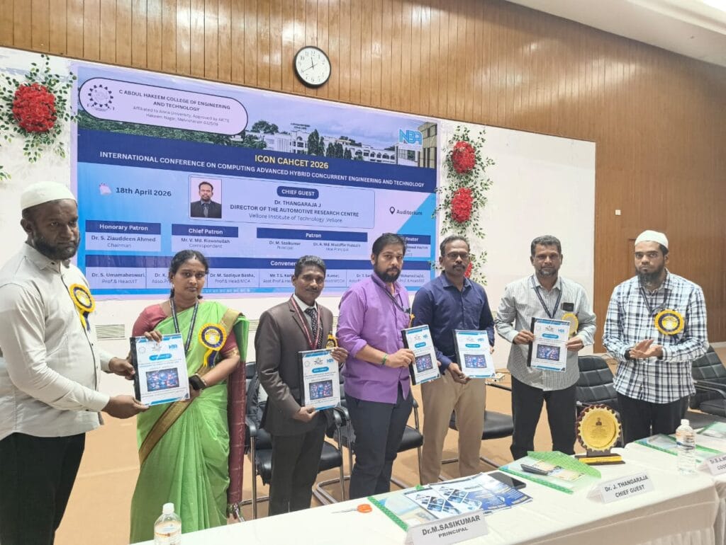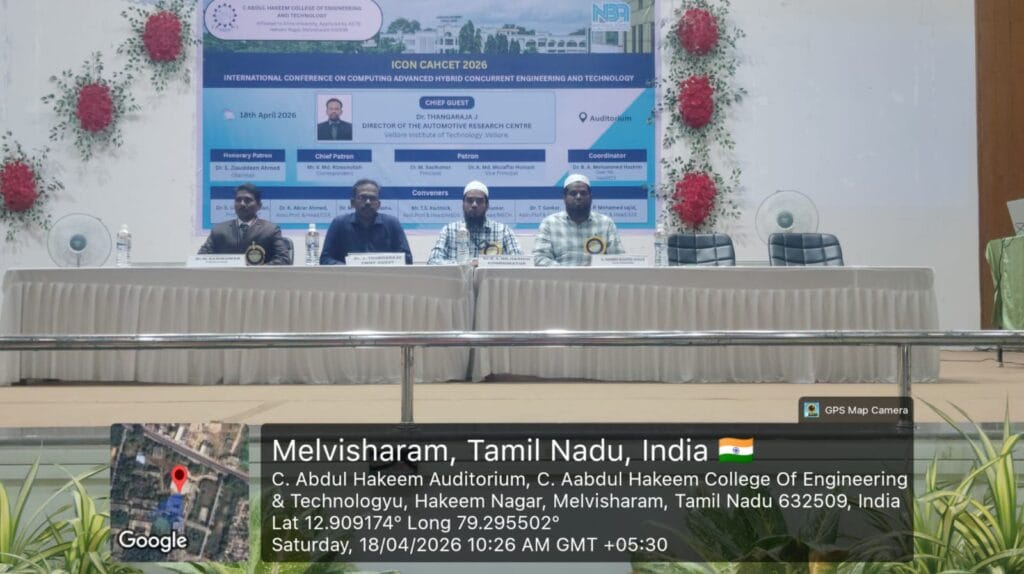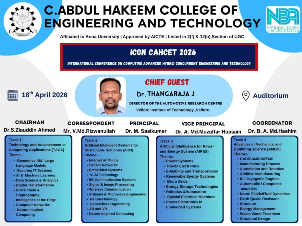 The Departments of MCA, IT, AI&DS, and CSE jointly conducted ICON CAHCET 2026 – Track 1 (ICTACA’ 2026) on 18-04-2026. The session was delivered by Dr. Thangaraja J, Director of the Automotive Research Centre at Vellore Institute of Technology, Vellore and was coordinated by Dr.M.Saadique Basha , Head/Prof./MCA ,B. S. Vijaya Baskar,AP/MCA and all faculty memebers from MCA for MCA Track 1. The event was graced by the presence of Principal Dr. M. Sasikumar and Vice Principal Dr. Md. Muzaffar Hussain , along with the ICON Coordinator Dr. B. A. Md. Hashilm , Head / Assoc.Professor / ECE and was conducted successfully with active participation from various external college students.