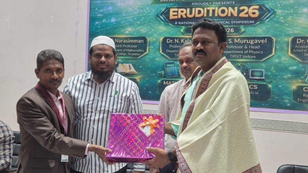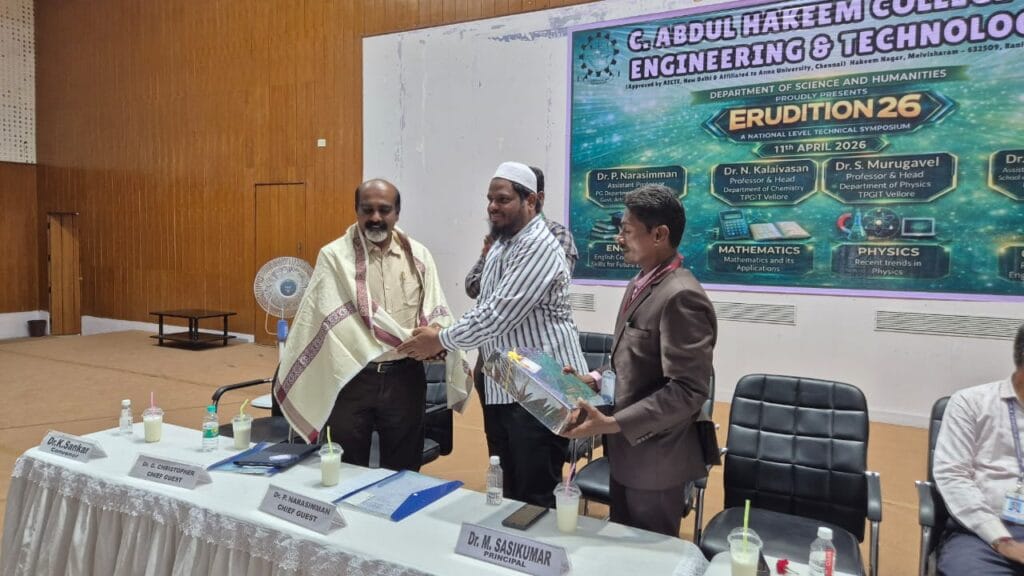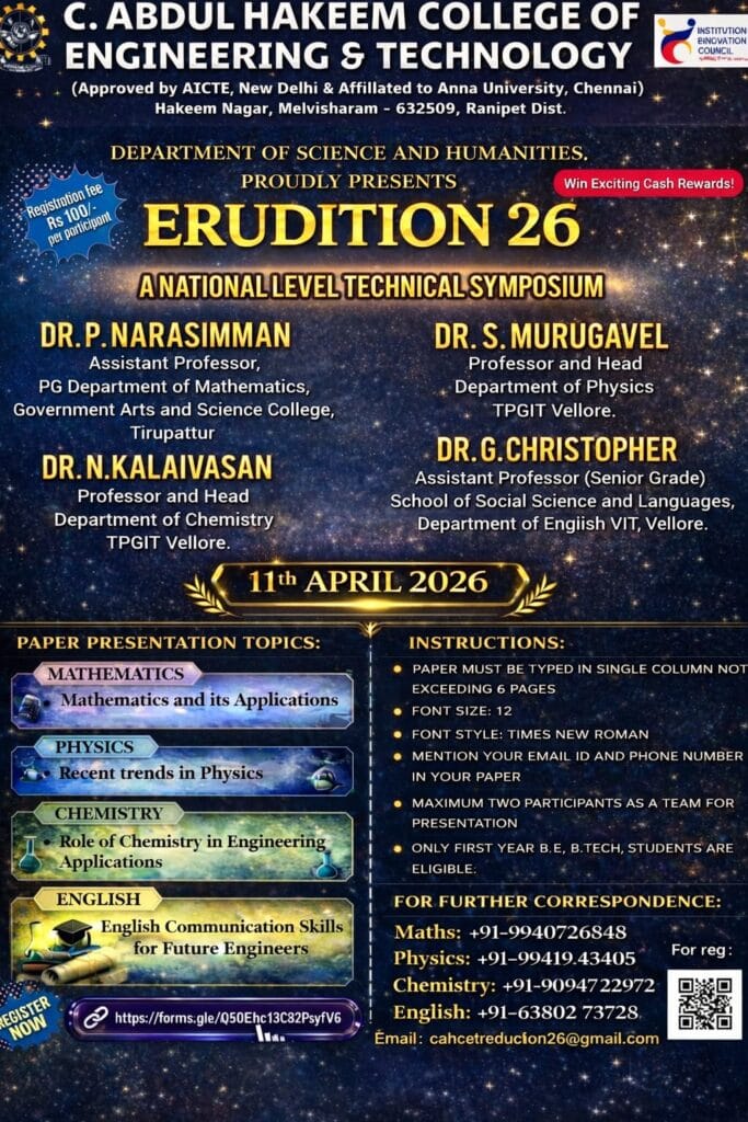 The Department of Science and Humanities of C. Abdul Hakeem College of Engineering and Technology, Melvisharam, successfully organized a National Level Technical Symposium titled “ERUDITION–26” on 11th April 2026. The primary objective of the symposium was to provide a platform for students to showcase their knowledge, technical skills, and innovative ideas in various disciplines such as Mathematics, Physics, Chemistry, and English. The event witnessed enthusiastic participation from first-year B.E. and B.Tech students from different institutions. The program commenced with a formal inaugural session in the presence of distinguished academicians and faculty members. The invited speakers for the symposium were Dr. P. Narasimman, Assistant Professor, PG Department of Mathematics, Government Arts and Science College, Tirupattur; Dr. S. Murugavel, Professor and Head, Department of Physics, TPGIT, Vellore; Dr. N. Kalaivasan, Professor and Head, Department of Chemistry, TPGIT, Vellore; and Dr. G. Christopher, Assistant Professor (Senior Grade), School of Social Science and Languages, VIT, Vellore. Their valuable insights and motivational words inspired the participants.