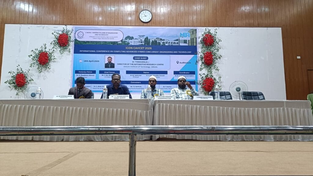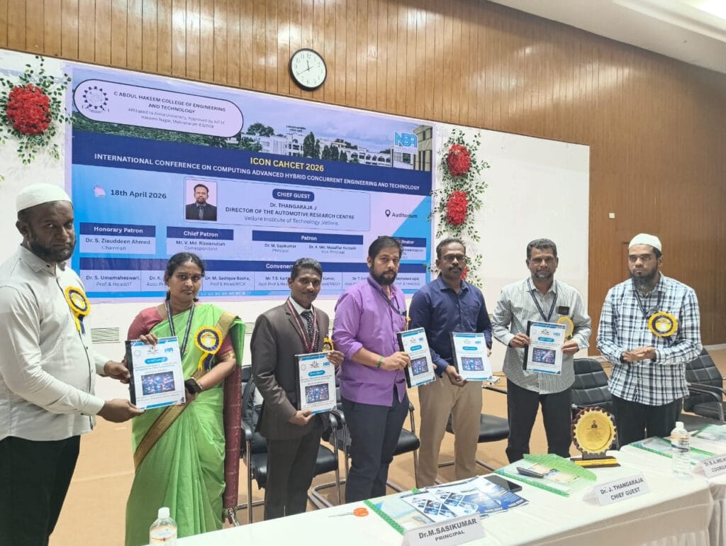 The International Conference on Computing Advanced Hybrid Concurrent Engineering and Technology (ICON CAHCET 2026) successfully hosted Track 1: Technology and Advancement in Computing Applications (ITACA) on 18th April 2026 at C. Abdul Hakeem College of Engineering and Technology. Organized jointly by the IT, CSE, AI&DS, and MCA departments, the event began with an inaugural session and the release of the conference souvenir. Dr. Thangaraja J, Director of the Automotive Research Centre at VIT, Vellore, graced the occasion as Chief Guest, inspiring participants with his insights on emerging technologies. The track saw strong participation with 34 external contributors, presenting 16 papers offline and 18 online, alongside numerous internal submissions from faculty and students. Sessions covered diverse topics such as cyber security, AI, data science, machine learning, cloud computing, and networking, fostering interactive discussions and knowledge exchange. The valedictory session concluded with certificate distribution, marking the success of ITACA 2026 as a collaborative and interdisciplinary research platform.