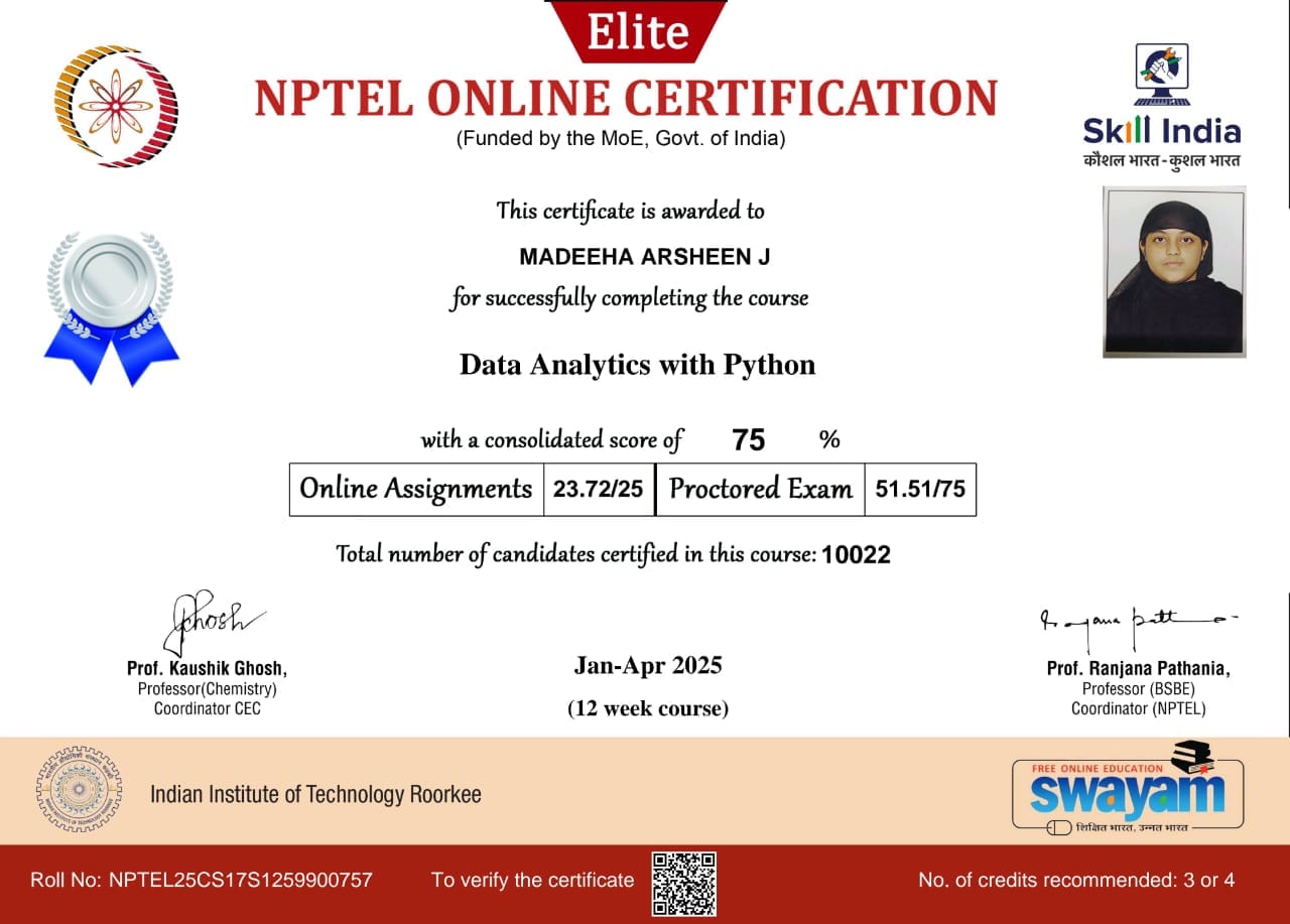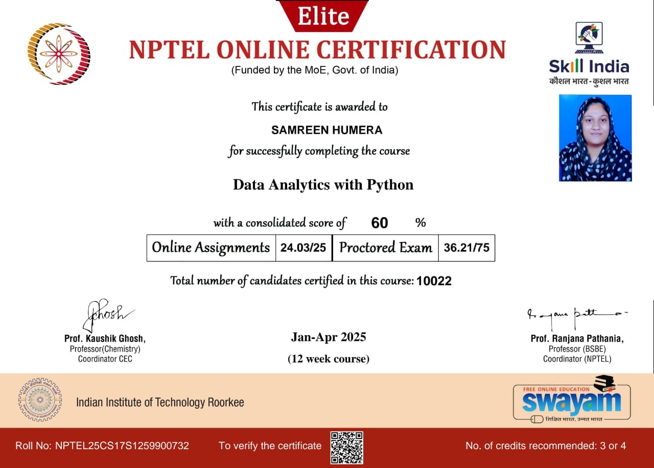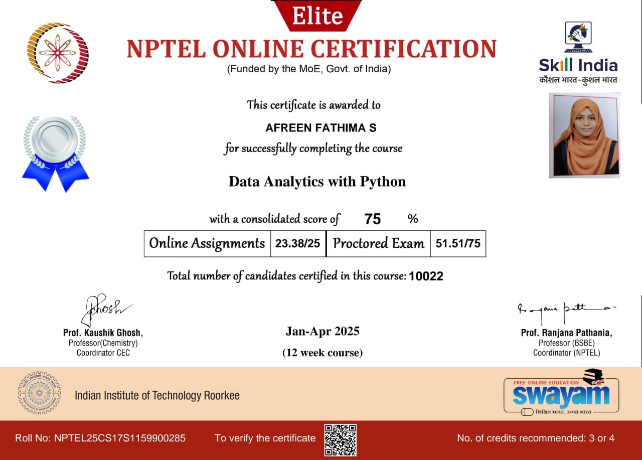 Samreen Humera, Afreen Fathima, Madheeha Arsheen, Ruqyya Nazeene , Udhaya Kumar, Mohammed Shahid and Suresh Krishnan of AI & DS – 3rd Year have successfully completed the NPTEL examination, passed with merit, and received their certificates of achievement.
