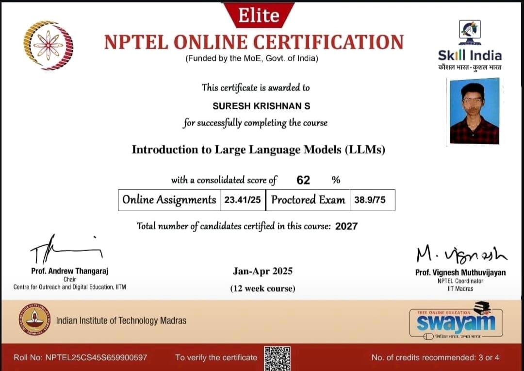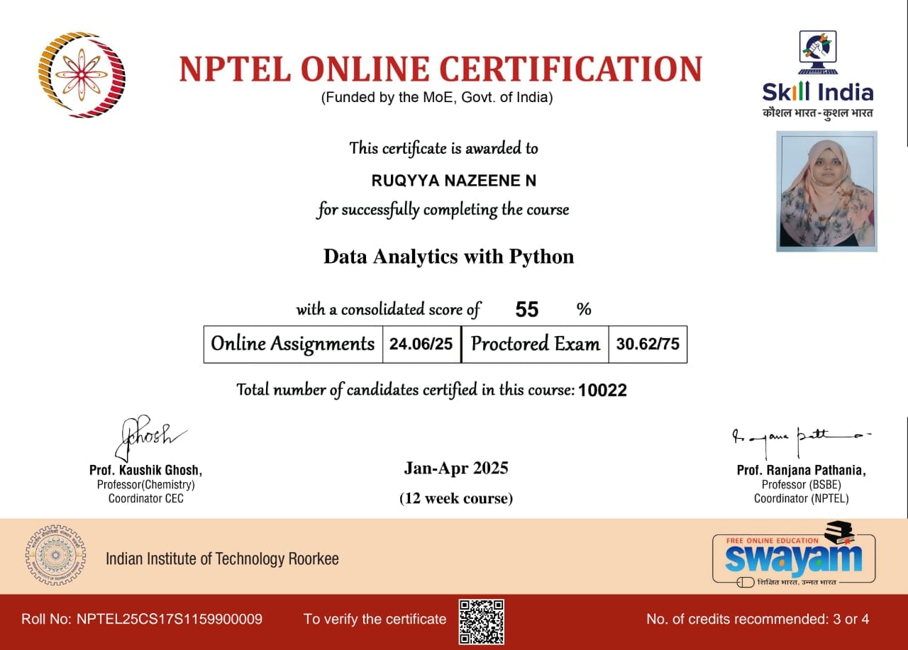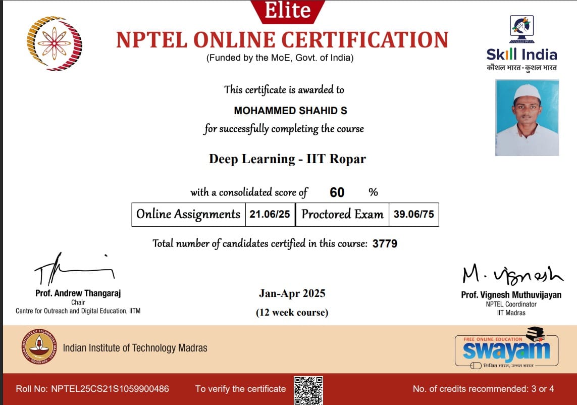 Samreen Humera, Afreen Fathima, Madheeha Arsheen, Ruqyya Nazeene , Udhaya Kumar, Mohammed Shahid and Suresh Krishnan of AI & DS – 3rd Year have successfully completed the NPTEL examination, passed with merit, and received their certificates of achievement.