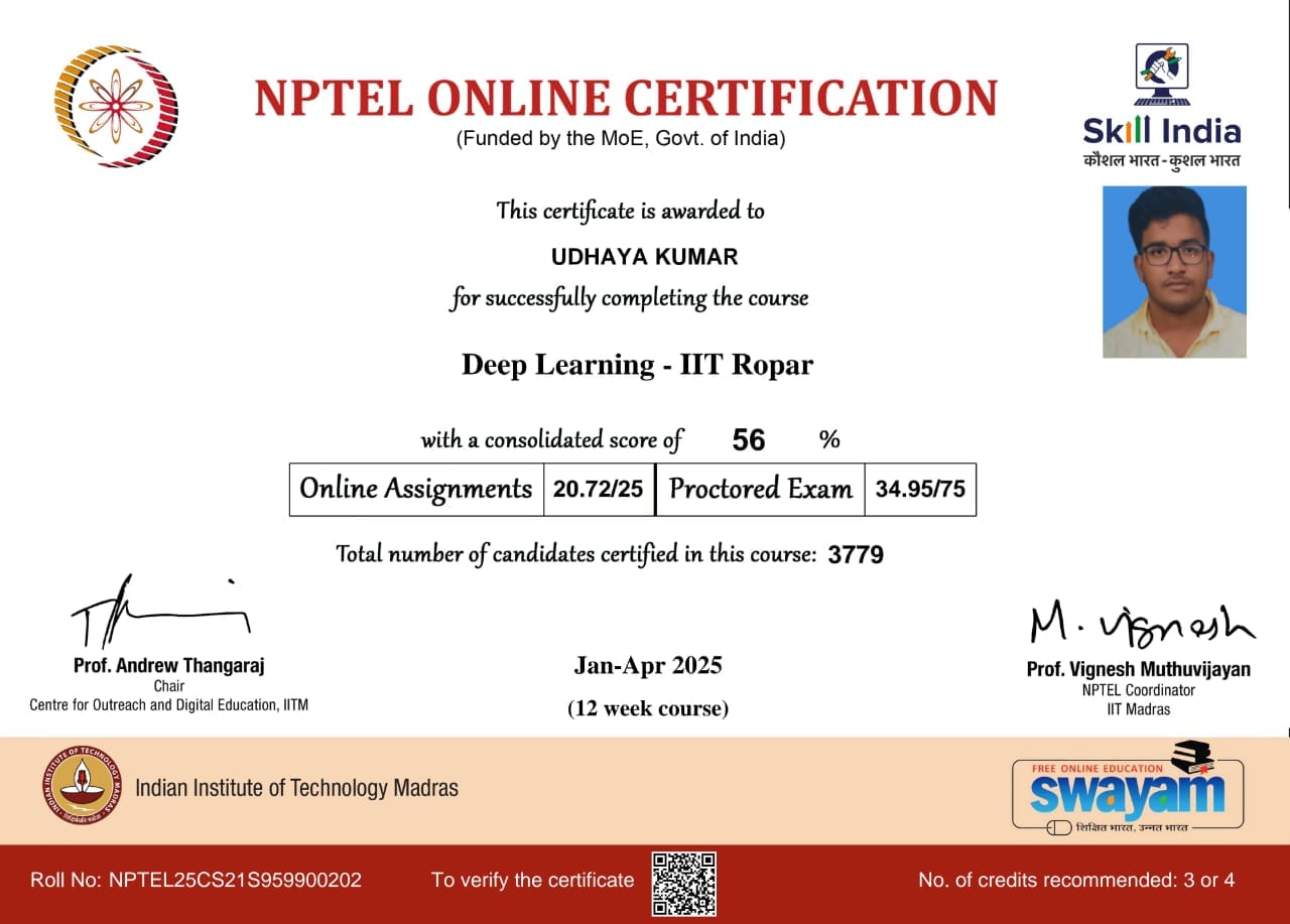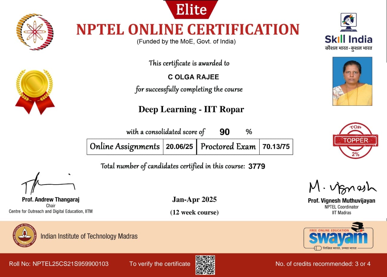 Mrs. C. Olga Rajee completed an NPTEL Online Certification course on DEEP LEARNING – IIT ROPAR with a consolidated score of 90%.
