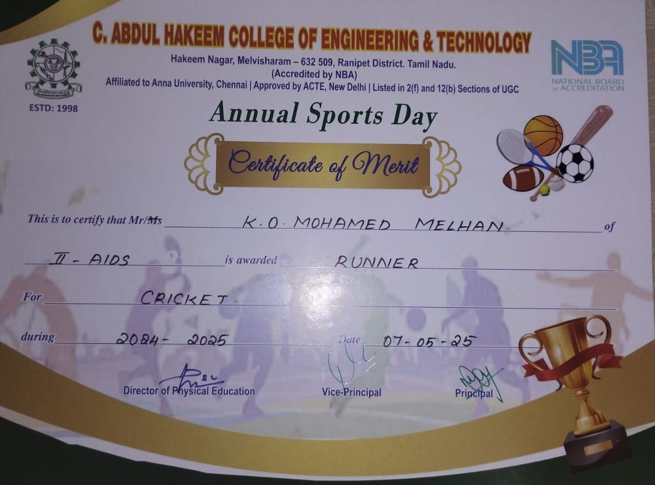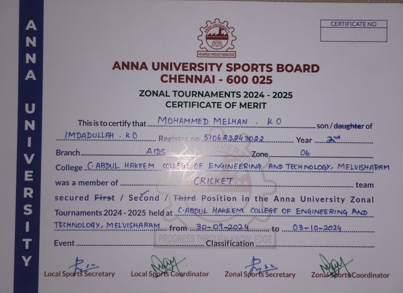 -Runner up in ANNA UNIVERSITY ZONAL TOURNAMENT in Cricket